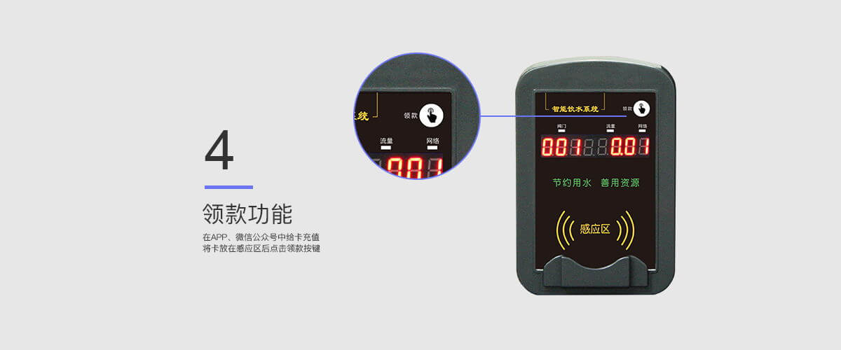 - 可接入微信公眾號,無人值守,用戶自助充值。支持領款和消費的一體機。
